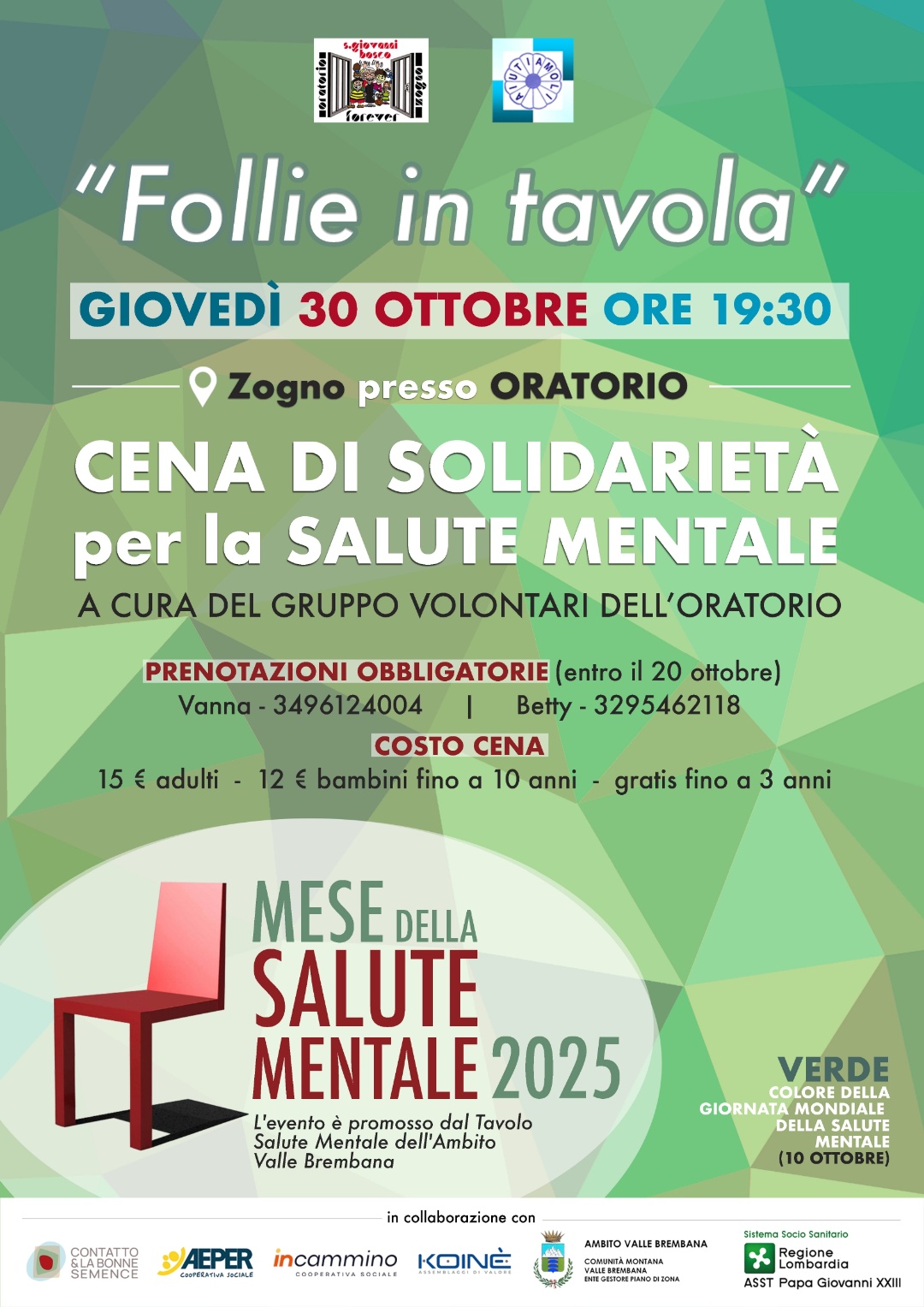 il giorno giovedì 30 ottobre è prevista la CENA DI SOLIDARIETÀ alle ore 19.30 presso l'Oratorio di Zogno.