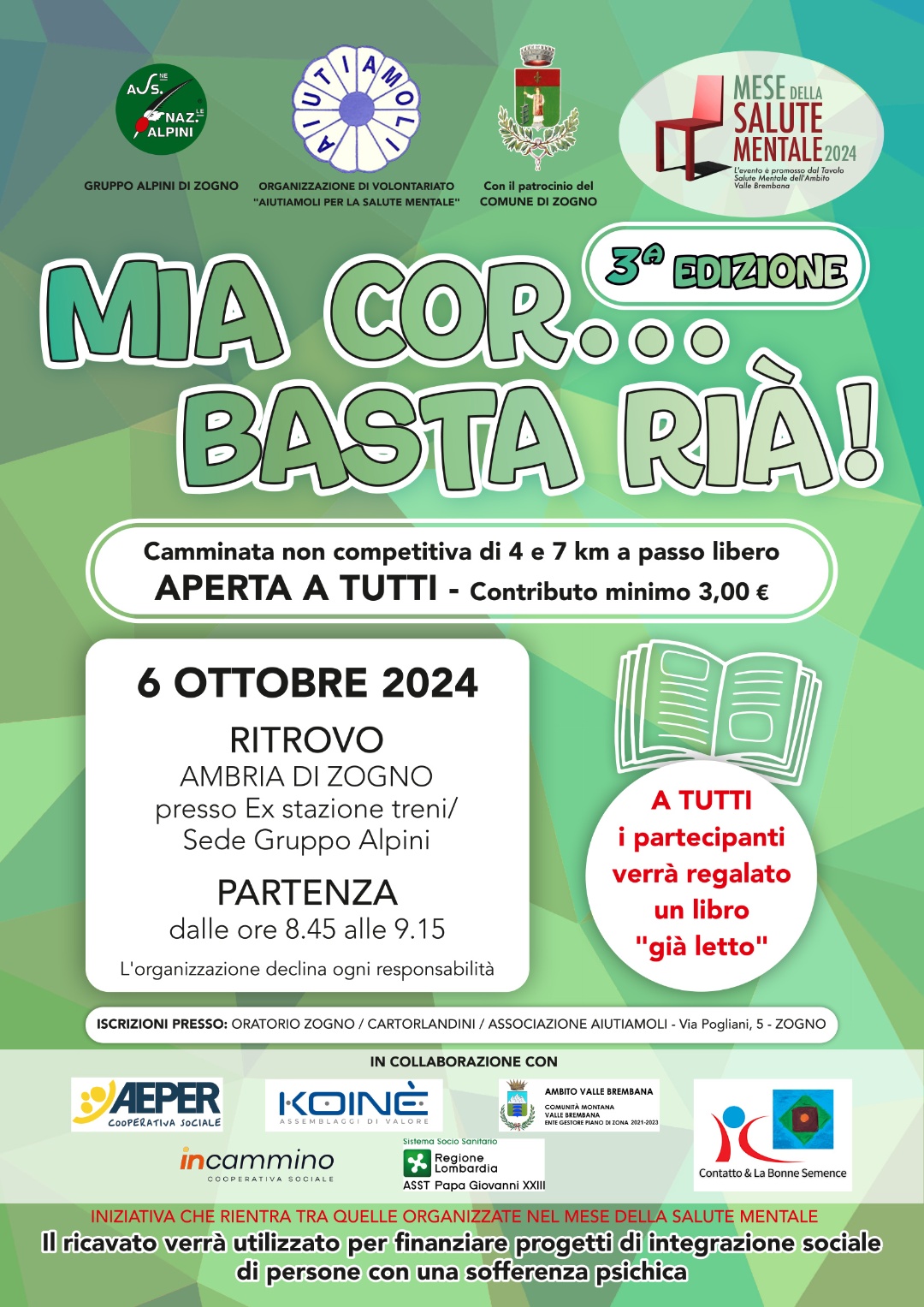 Domenica 6 ottobre 2024 si terrà la 3^ edizione della Camminata non competitiva di 4 e 7 km "MIA COR... BASTA RIÀ!", iniziativa che rientra tra quelle organizzate dal Tavolo Salute Mentale dell'Ambito Valle Brembana in occasione del Mese della Salute Mentale.